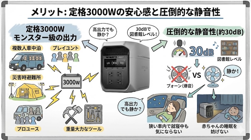 ただし、「極限まで無音にこだわりたい」「夜間に車内で急速充電したい」という特異な環境であれば、DELTA 3 Max Plusの静音性が活きる。
