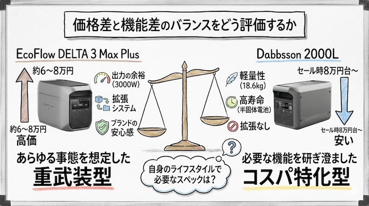 EcoFlowのDELTA 3 Max Plusとダブソンの2000L、どちらも2000Whクラスで気になっているんですが…