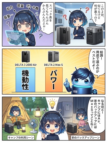 軽さ・価格・持ち運びやすさを重視するならDELTA 3 2000 Air、高出力家電の使用・長寿命・拡張性を重視するならDELTA 2 Max Sがおすすめです。アウトドア中心ならAir、家庭用バックアップ中心ならMax Sという選び方が分かりやすいです。