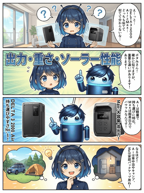 DELTA 3 2000 AirとDELTA 3 Maxは、容量こそ近いものの出力性能・重量・価格などに明確な違いがあります。
