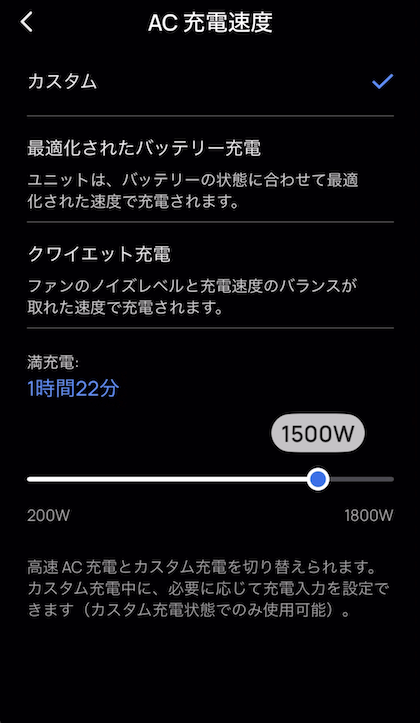 背面スイッチを 「ADJUST」 に切り替えると、アプリで設定した出力値が優先されます。アプリ側から充電出力(200〜1800W)まで細かい調整が可能。