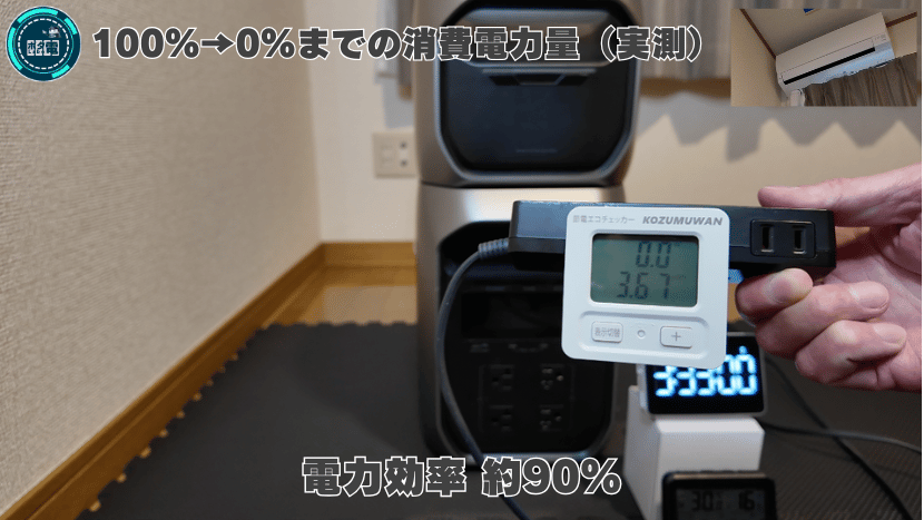 ここでは、DELTA 3 Max Plus+専用エクストラバッテリー(EXBT)を使用し、エアコンを連続運転した際の消費電力量を実測。放電時の電力効率を検証。