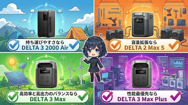 軽さとコスパを重視するならDELTA 3 2000 Air、拡張性を重視するならDELTA 2 Max S、最新設計の高効率モデルを求めるならDELTA 3 Max、性能を最優先するならDELTA 3 Max Plusが候補になります。