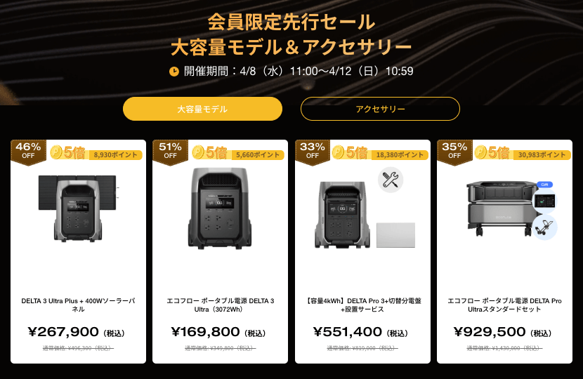 待ちに待った会員フェスタの先行セールがスタート。DELTAシリーズなど人気ポータブル電源が大幅値引きで登場し、さらに特典付きモデルも。